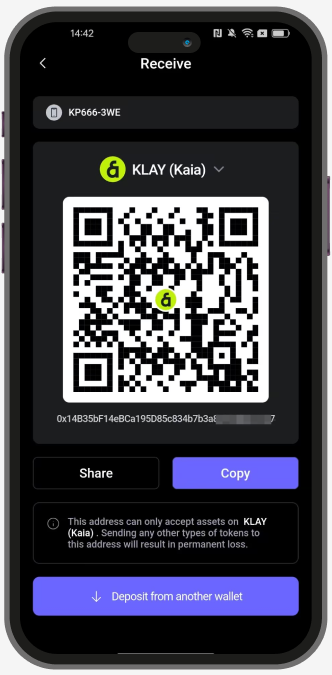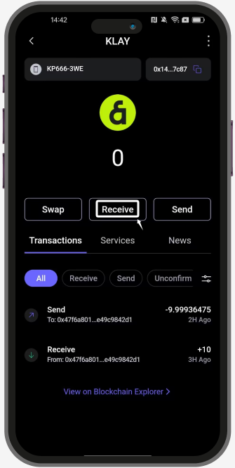 Gently click on the $KLAY(Kaia) coin that you want to receive, and click the ‘Receive’ tab.Copy or share the wallet address with your friends, and start receiving the $KLAY(Kaia) using the address!