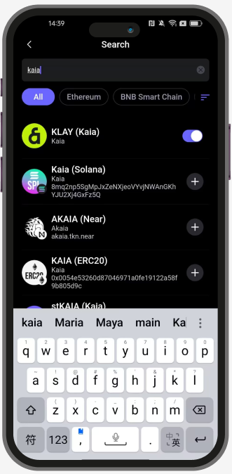 Select the coin or token that you’d like to add, we will choose the $KLAY(Kaia) in this article, and click the ‘+’ button.