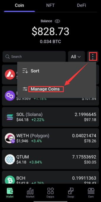 Launch your SafePal App, click the icon with the three dots, then click ‘Manage Coins’ on the App homepage.