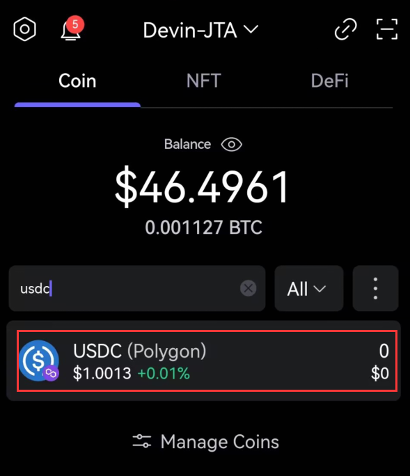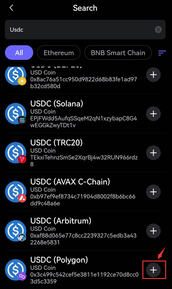Select the coin that you’d like to add, which is $USDC(Polygon) in this case and click the ‘+’ button.