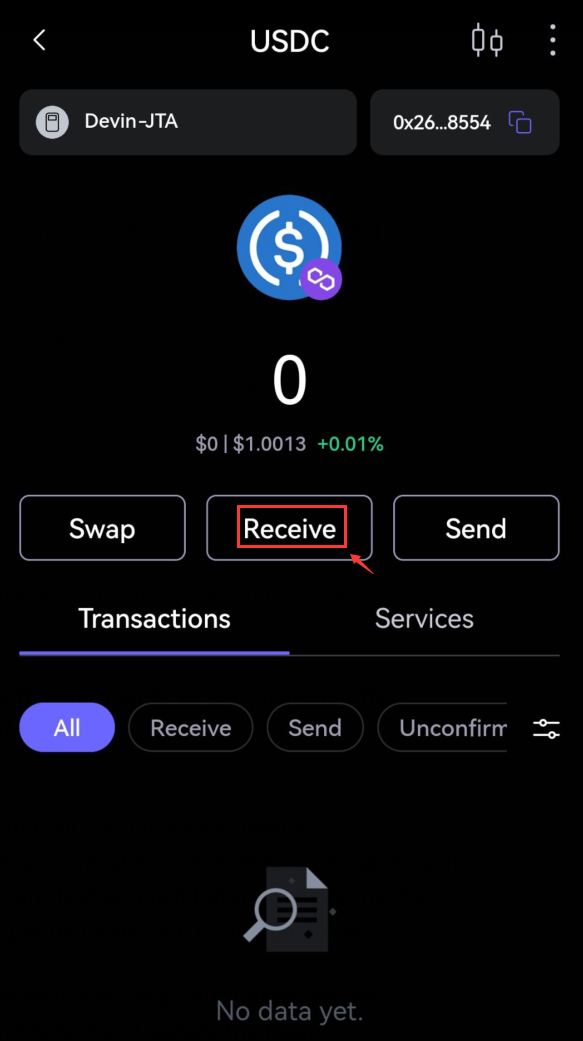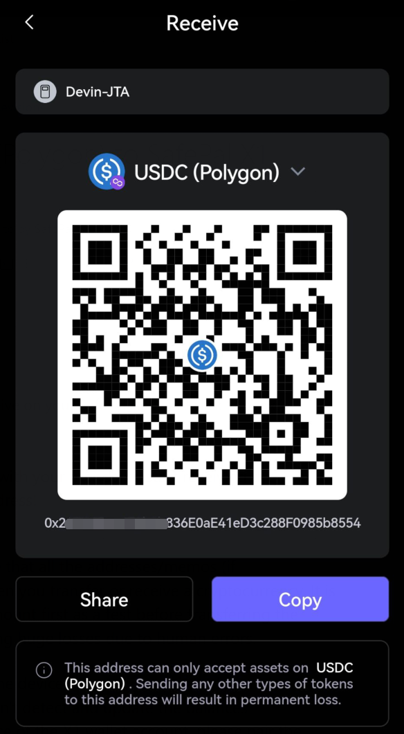 Copy or share the wallet address with your friends, to start receiving the $USDC(Polygon) coins using the address!