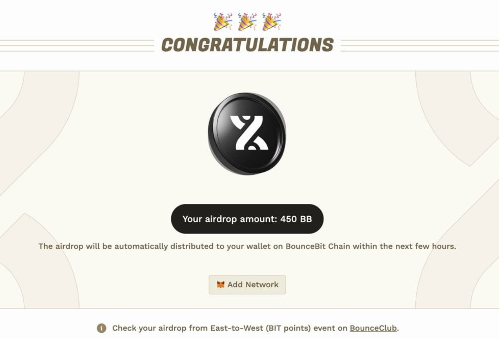 成功连接 SafePal 钱包与 BounceBit App后,如果你的地址符合BounceBit空投条件,你就可以查看 BounceBit 空投代币情况和进行领取代币!