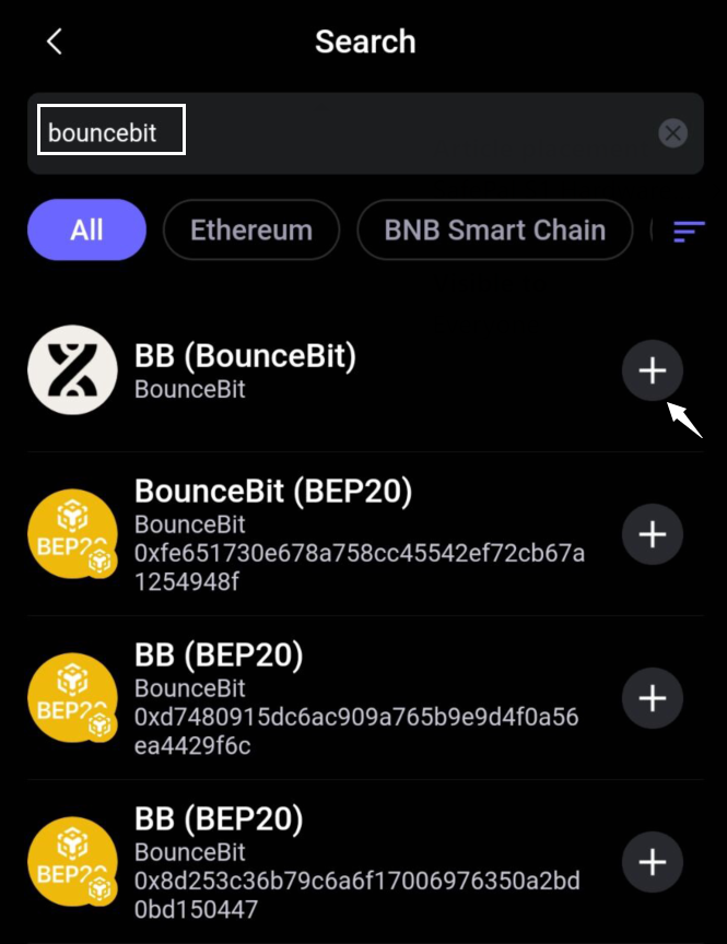Step 3 Search the coin name that you want to add, in the case here we will search 'BB(BounceBit)', and click '+' on the right side of it.