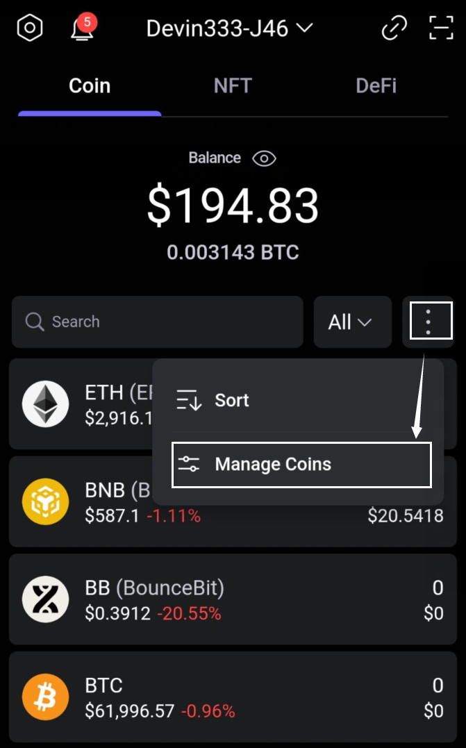 Step 2 Open the SafePal App and navigate to the Coin Management page by clicking on the 'three-dot' icon on the App homepage. This should be the wallet that you paired with your S1 hardware wallet.