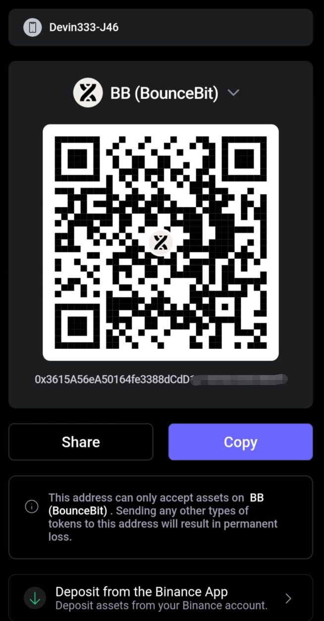 Copy or share the wallet address with your friends, then you can start to receive the $BB(BounceBit) coins using the address!