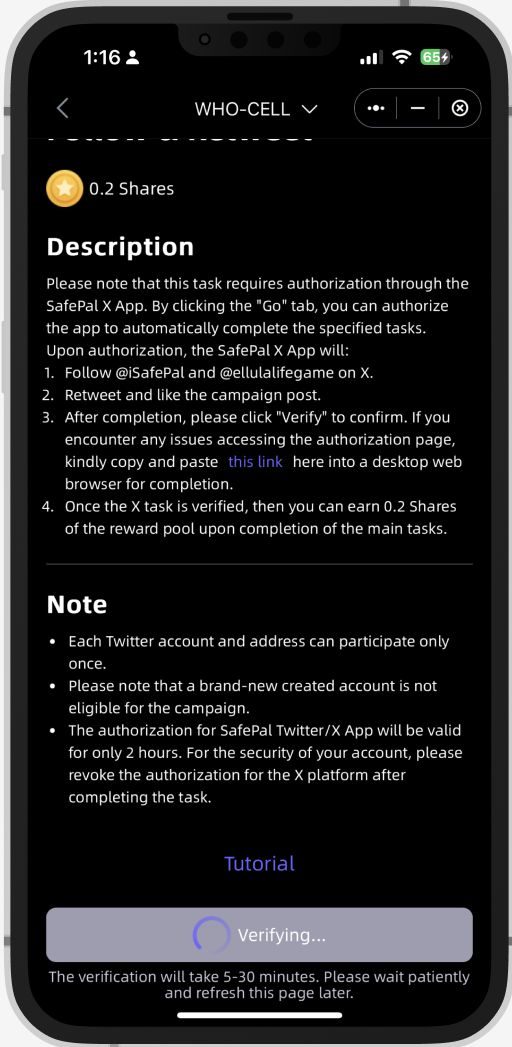 Then go back to the SafePal App task page, click Verify tab to check whether you have successfully completed the Follow&Retweet task.