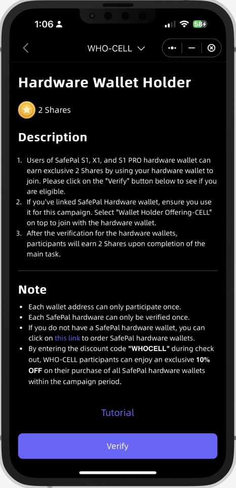 Click Verify to complete the verification of whether you are a hardware wallet holder.