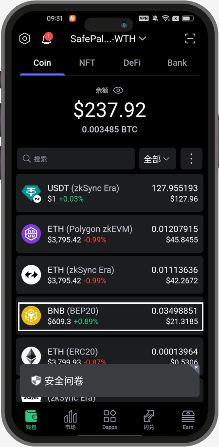 第2步 在钱包中准备一些 $BNB(BEP20)