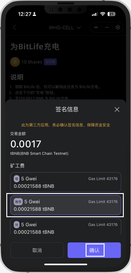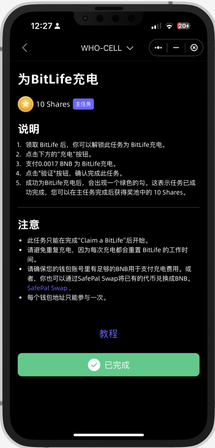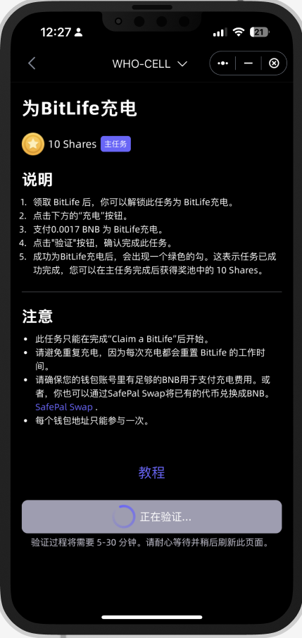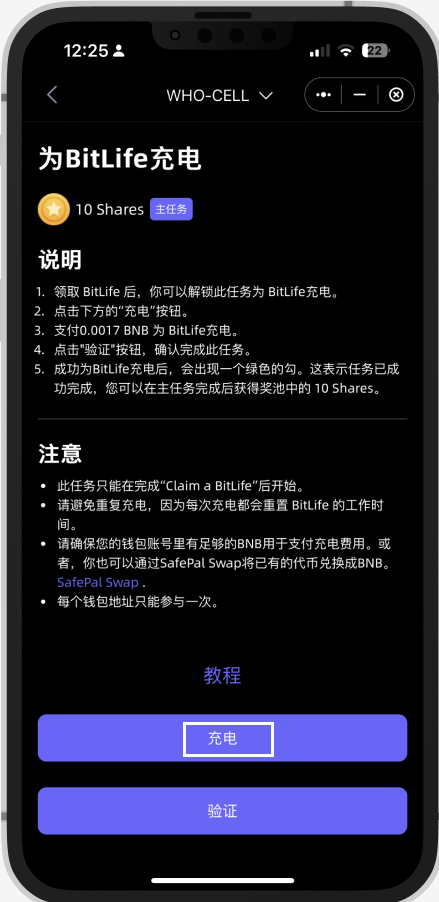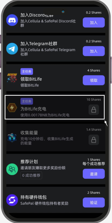 由于 Cellula 是一款全链AI 游戏,这个任务会需要在链上签名所以会消耗 $BNB(BEP20) 作为 gas fee。请确保您有足够的 BNB 作为 gas fee来参加这次活动。如果没有BNB币,你也可以用SafePal 闪兑兑换一些或者直接转入BNB。领取 BitLife NFT后,你可以解锁任务以对其进行充电。