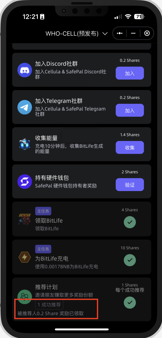 重要提示:请务必完成“为BitLife充电” 这个主任务。不然这个任务的份额奖励会被视为无效。所以请一定记得完成WHO-Cell活动的主任务。