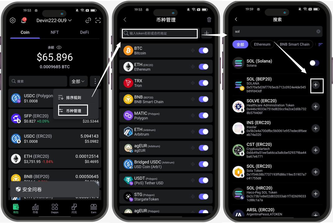 最后但同样重要的一点是,不要忘记将你喜欢的币种添加到钱包! 你可以依照下图的顺序添加币种到你的SafePal钱包。