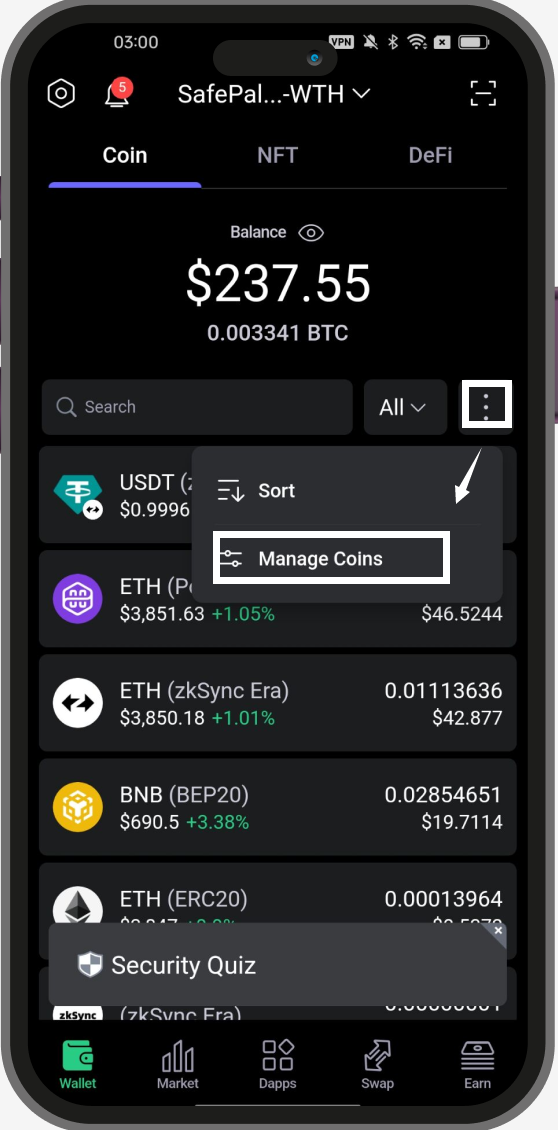 Launch your SafePal App, click the icon with the three dots, then click ‘Manage Coins’ on the App homepage.