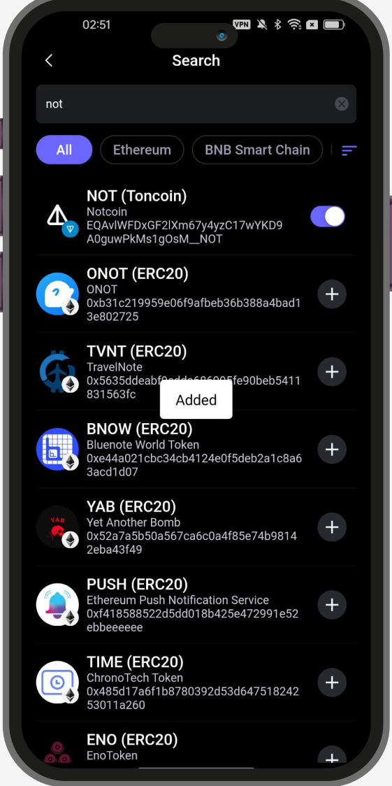 A notification ‘Added’ will pop up for a short while to indicate the Token is successfully added. You will then be able to check and find the $NOT(Toncoin) token in the Asset list.