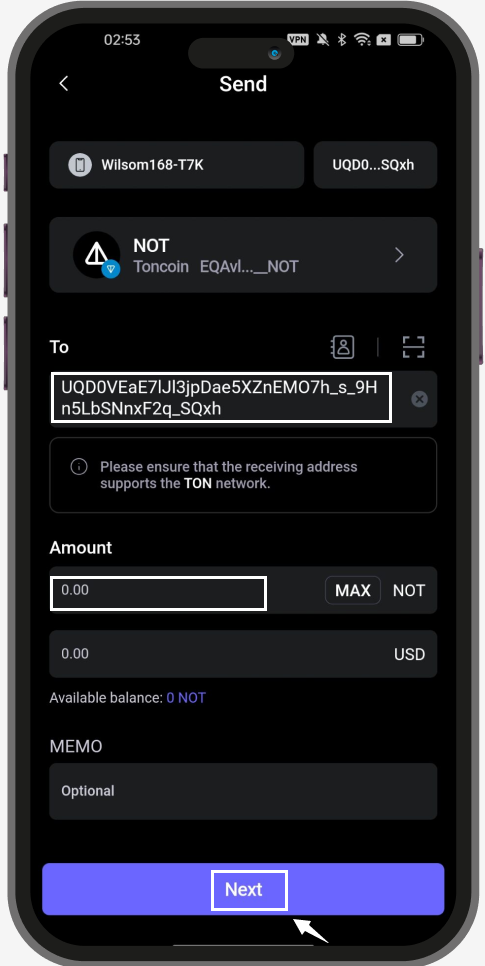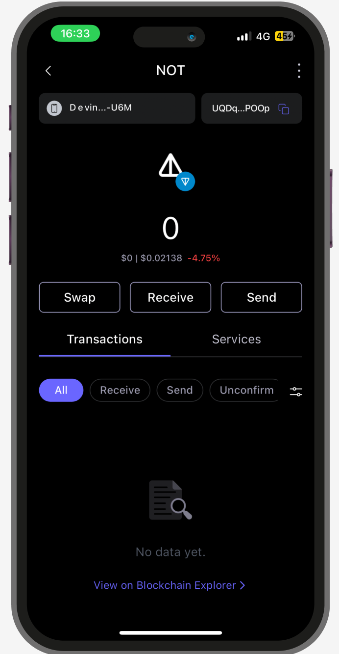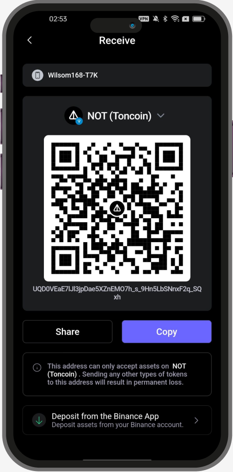 Copy or share the wallet address with your friends, then you can start to receive the $NOT(Toncoin) tokens using the address!