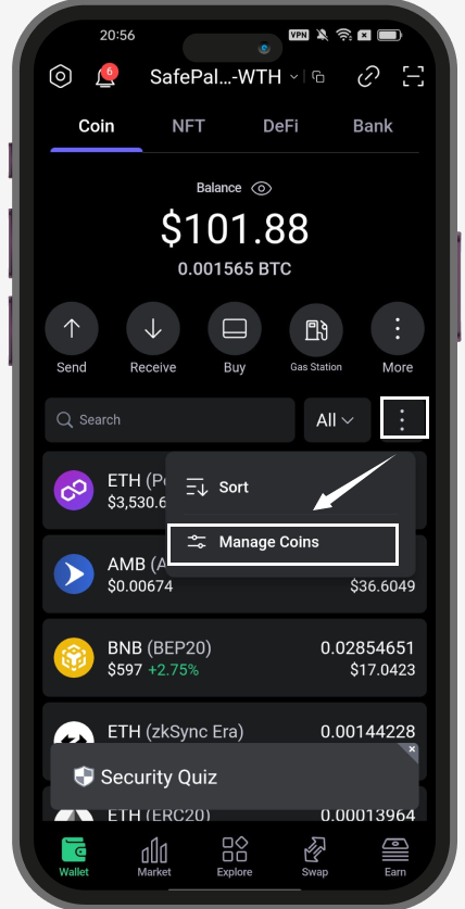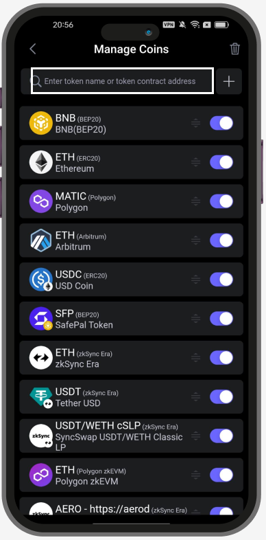 Launch your SafePal App, click the icon with the three dots, then click ‘Manage Coins’ on the App homepage.Click the ‘Query’ icon or the blank field after the button, then enter the coin or token name that you would like to add.
