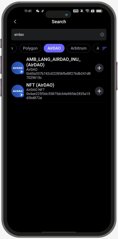 Select the coin or token that you’d like to add, we will choose the $AMB(AirDAO) in this article, and click the ‘+’ button.