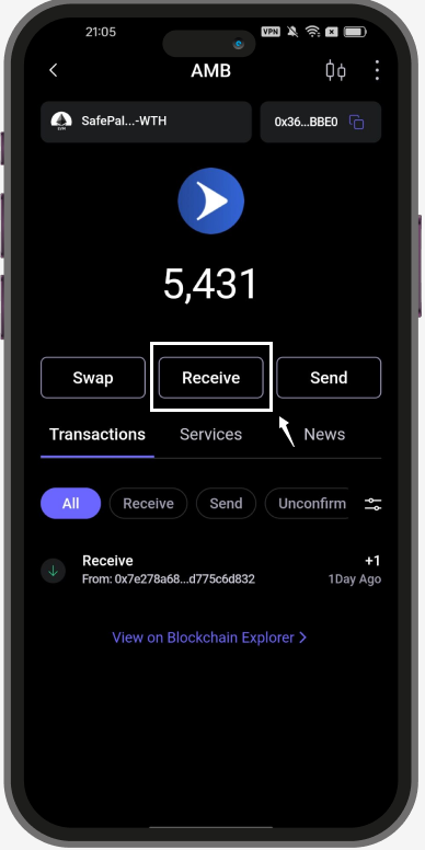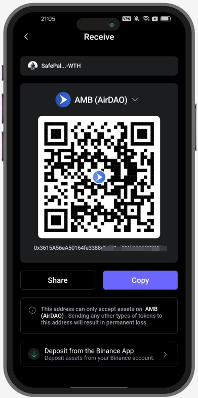 Gently click on the $AMB(AirDAO) that you want to receive, and click ‘Receive’.Copy or share the wallet address with your friends, and start receiving the $AMB(AirDAO) using the address!