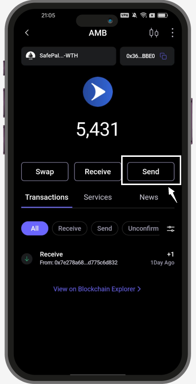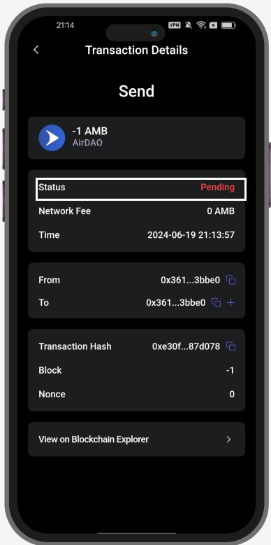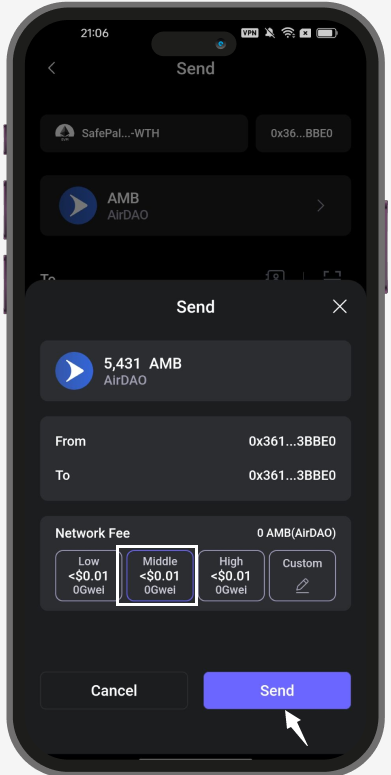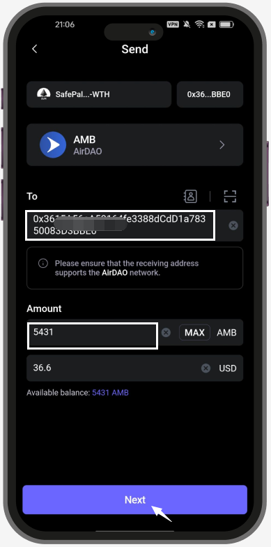 Gently click on the $AMB(AirDAO) that you want to send out, and click ‘Send’.Enter the amount and receipt address of the transaction, and click 'Next'.