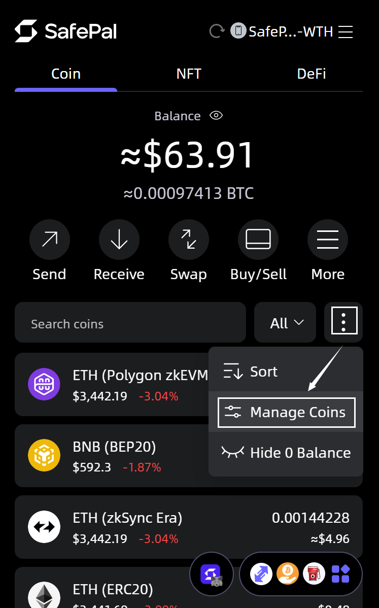 Launch your SafePal Extension Wallet, click the icon with the three dots, then click ‘Manage Coins’ on the Extension Wallet homepage.