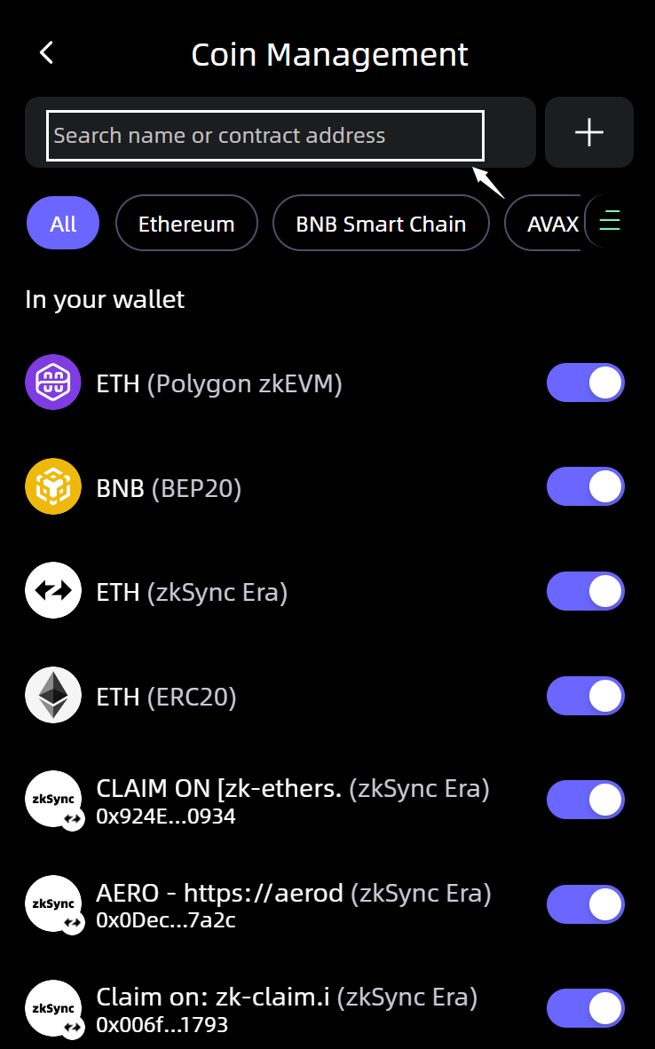 Click the ‘Query’ icon or the blank field after the button, then enter the coin name that you would like to add.