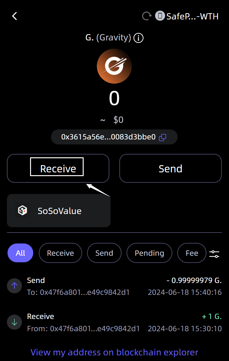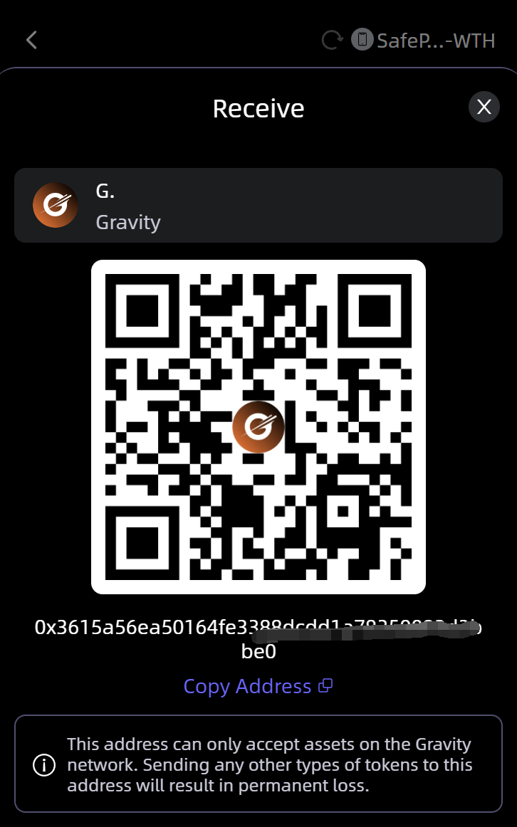Copy or share the wallet address with your friends, starting to receive the $G.(Gravity) coins using the address!