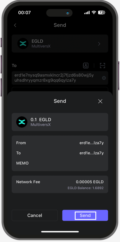 Gently click on the $EGLD(MultiversX) coins that you want to send out, and click ‘Send’.Enter the amount and receipt address of the transaction, and click 'Next'.