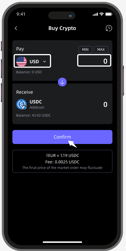 Choose a fiat currency and enter the amount that you would like to spend to purchase $USDC(Arbitrum), click the Confirm tab. There is minimum amount of $10. The higher your card tier, the less service fee you will pay.