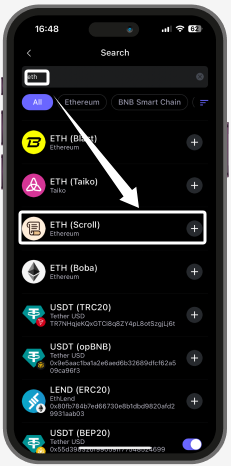 Select the coin or token that you’d like to add, we will choose the $ETH(Scroll) in this article, and click the ‘+’ button.