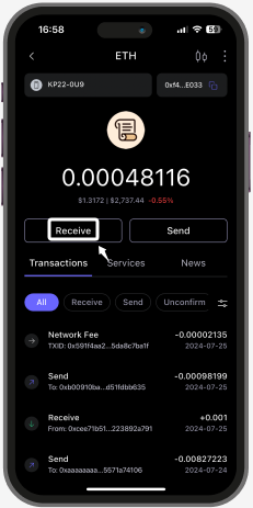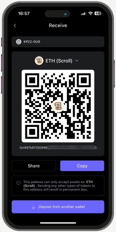 Gently click on the $ETH(Scroll) coin that you want to receive, and click the ‘Receive’ tab.Copy or share the wallet address with your friends, and start receiving the $ETH(Scroll) using the address!