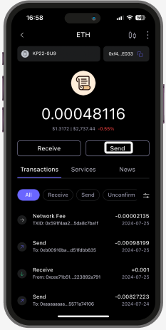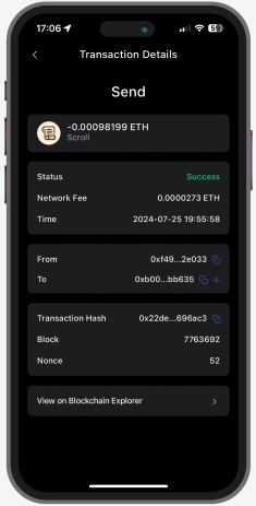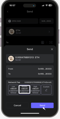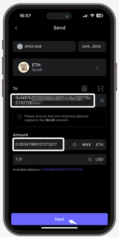 Gently click on the $ETH(Scroll) coins that you want to send out, and click ‘Send’.Enter the amount and receipt address of the transaction, and click 'Next'.