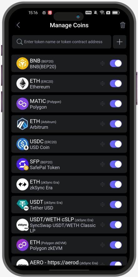 Launch your SafePal App, click the icon with the three dots, then click ‘Manage Coins’ on the App homepage.