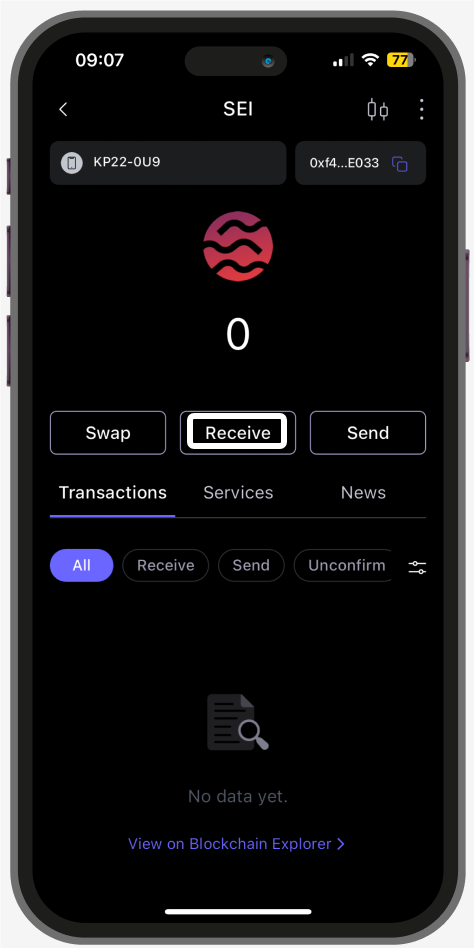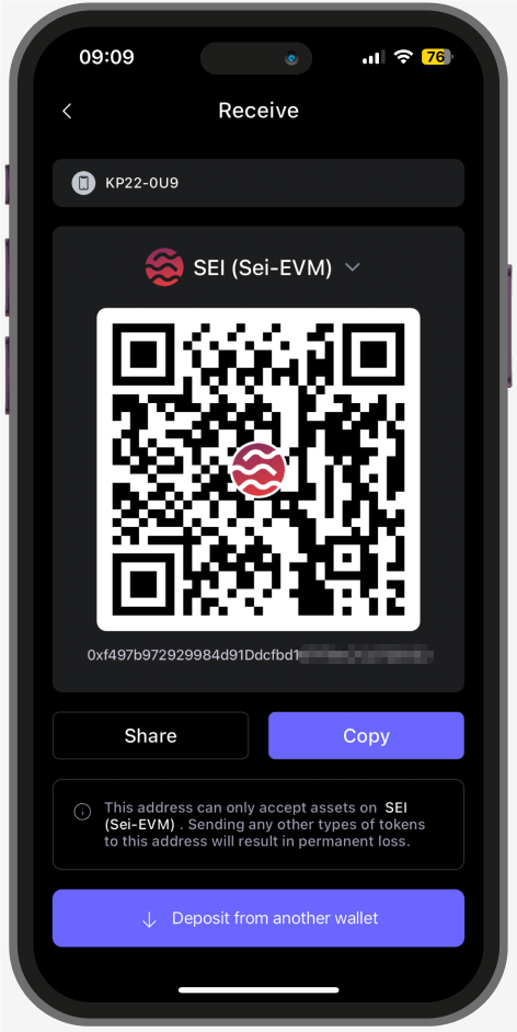 Gently click on the $SEI coin that you want to receive, and click the ‘Receive’ tab.Copy or share the wallet address with your friends, and start receiving the $SEI coins using the address!