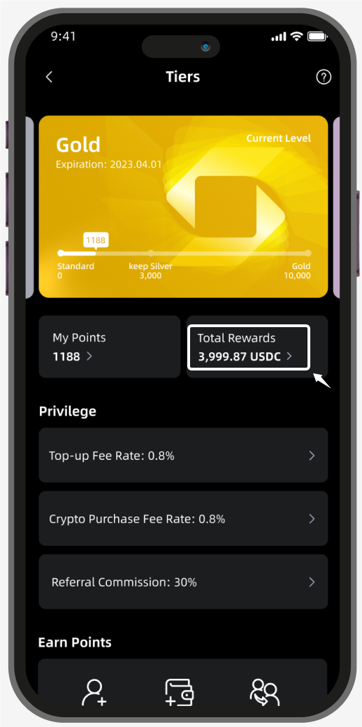 You can view the tiers and total rewards of your bank account, click the '>' icon after the rewards.