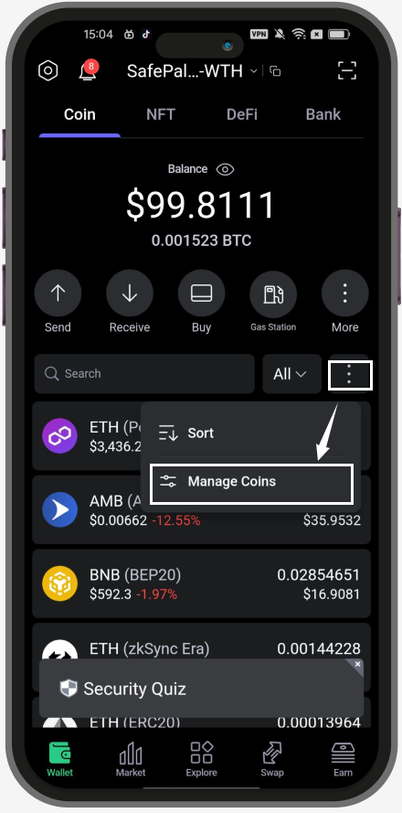 Launch your SafePal App, click the icon with the three dots, then click ‘Manage Coins’ on the App homepage.