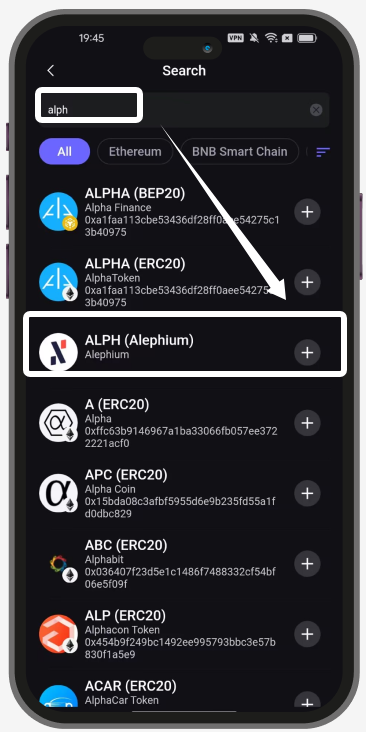 Select the coin that you’d like to add (which is $ALPH on the Alephium network in this case ) and click the ‘+’ button.