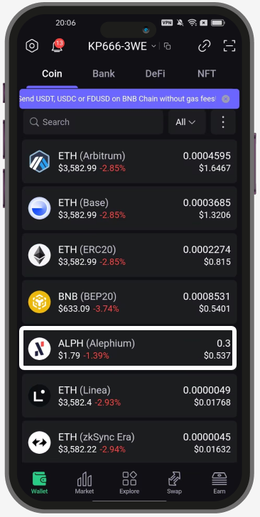 A notification ‘Added’ will pop up for a short while to indicate the $ALPH coin is successfully added. You can then check and find the $ALPH coin in the wallet asset list.