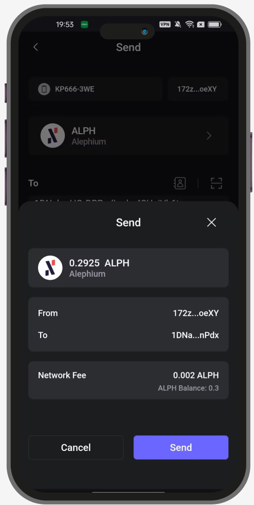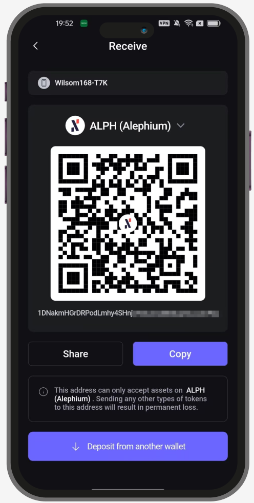 Copy or share the wallet address with your friends, then you can start to receive the $ALPH coins using the address!