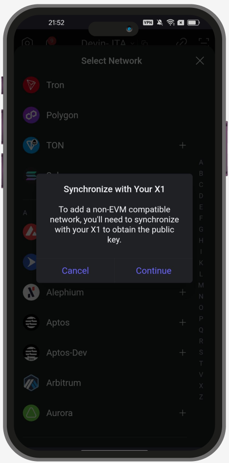 Click Continue on the SafePal App and enter your PIN code on the X1 device to synchronize with your X1 device.