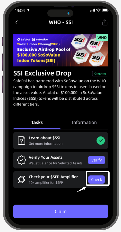 During the snapshot, your $SFP tokens staked in SFPlus were calculated at 10x value in Task 2. After the campaign begins, you can only receive the 10x boost by staking additional $SFP tokens with a 14-day lock period in Task 3 "Check your $SFP Amplifier." Any new stakes in SFPlus after the campaign starts will not be counted. Visit the WHO-SSI page to check requirements and stake your tokens.