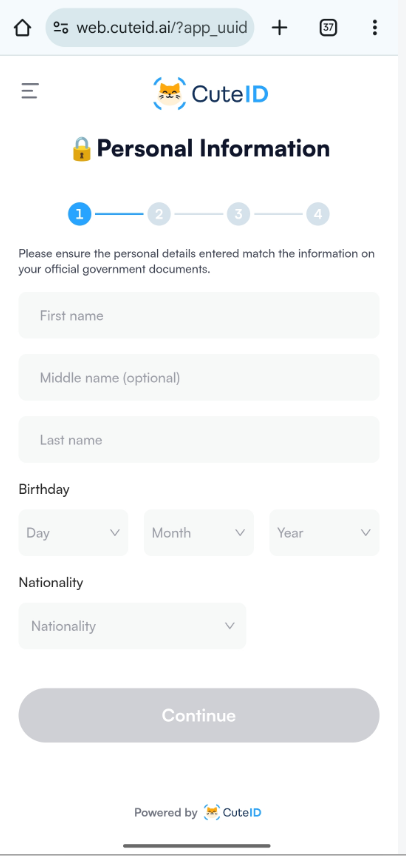 Follow the steps to accurately fill in your personal information, and finally click the Continue button to complete the verification process.