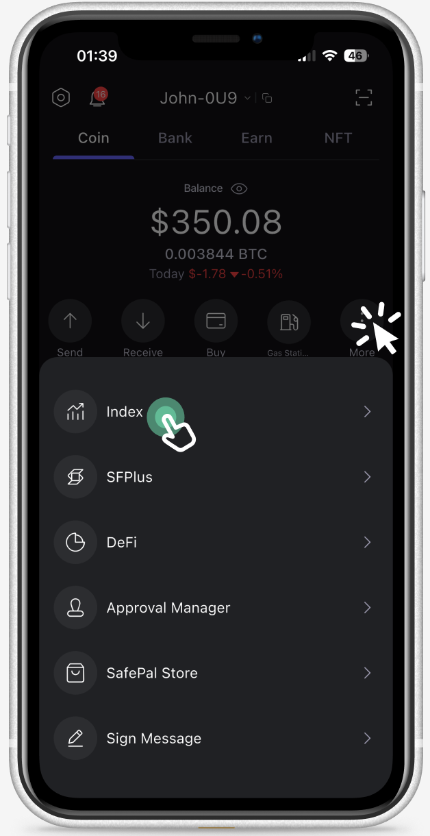 Once you’ve completed the setup, open your SafePal App. On the wallet page click the More tab and tap the Index tab on your SafePal App homepage.