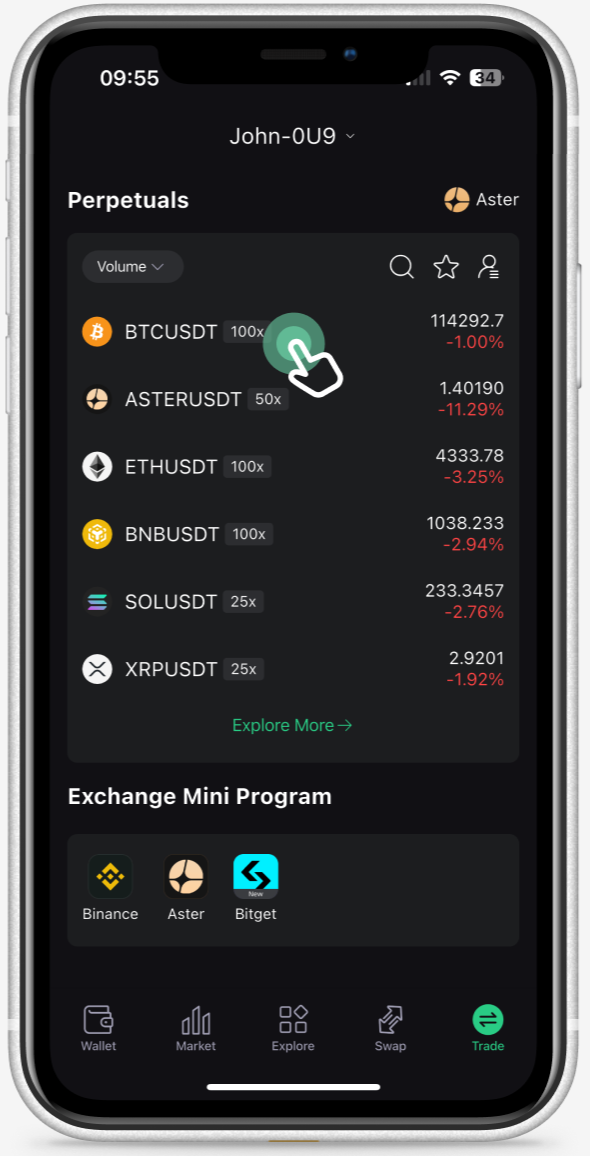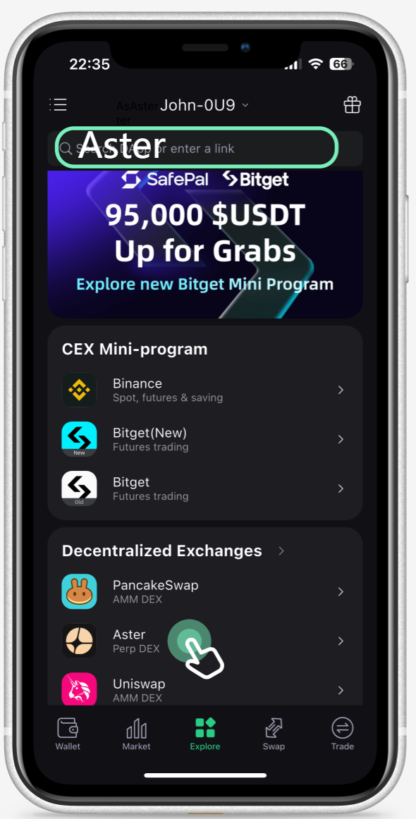 Also, you can input 'Aster' to search for Aster DApp, or simply click the Aster DApp tab to enter Aster Perp DEX from the SafePal Explorer center.