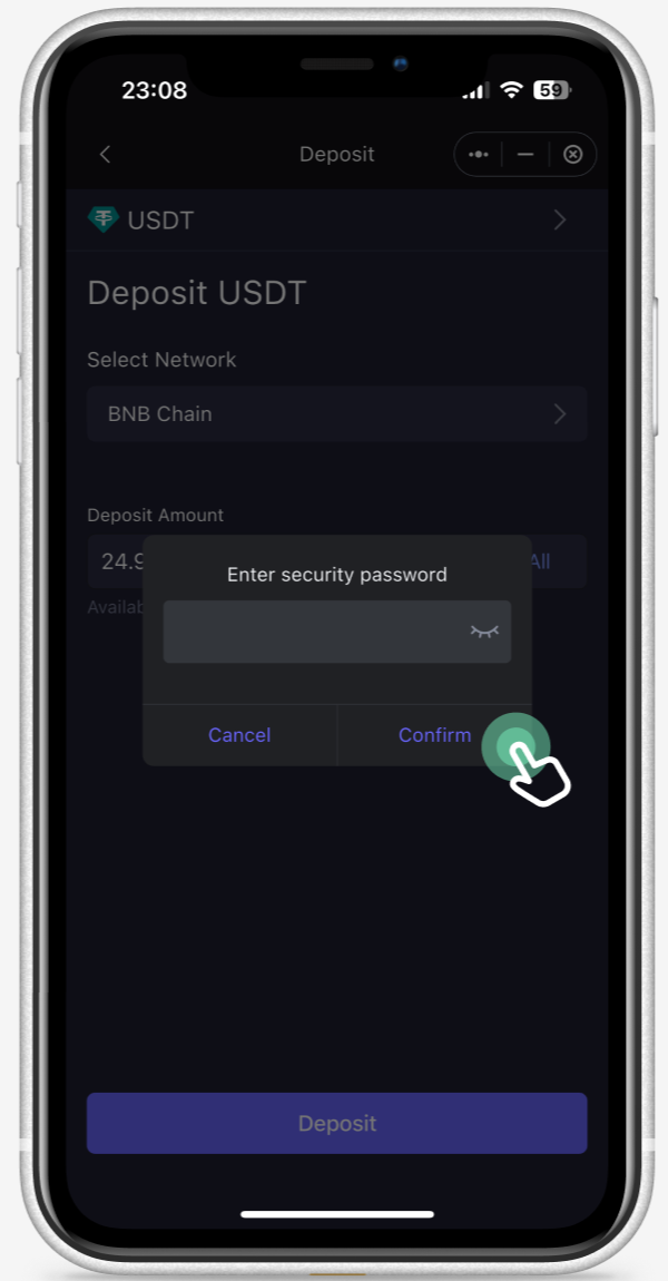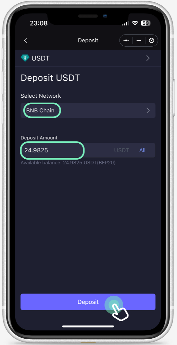 Choose the network and enter the amount of $USDT for your deposit to Aster.
