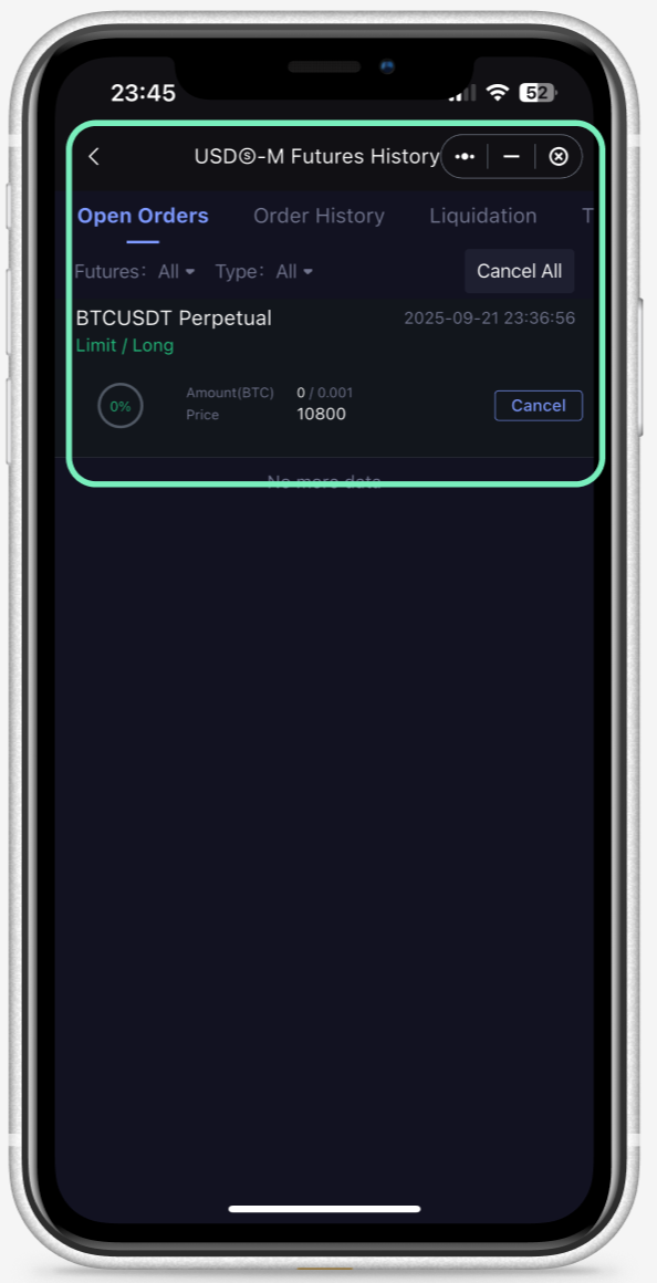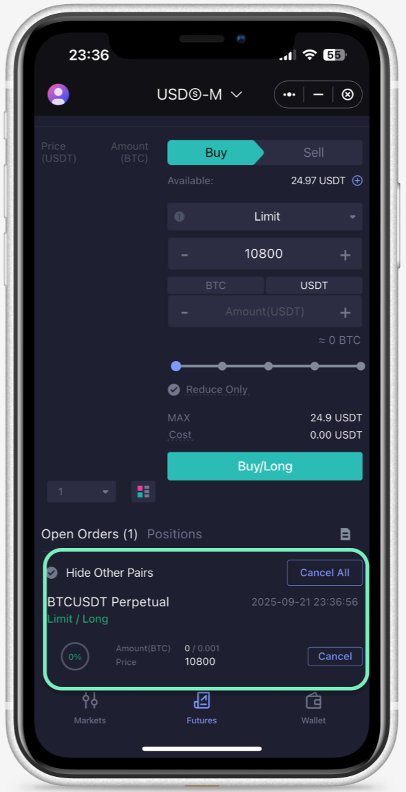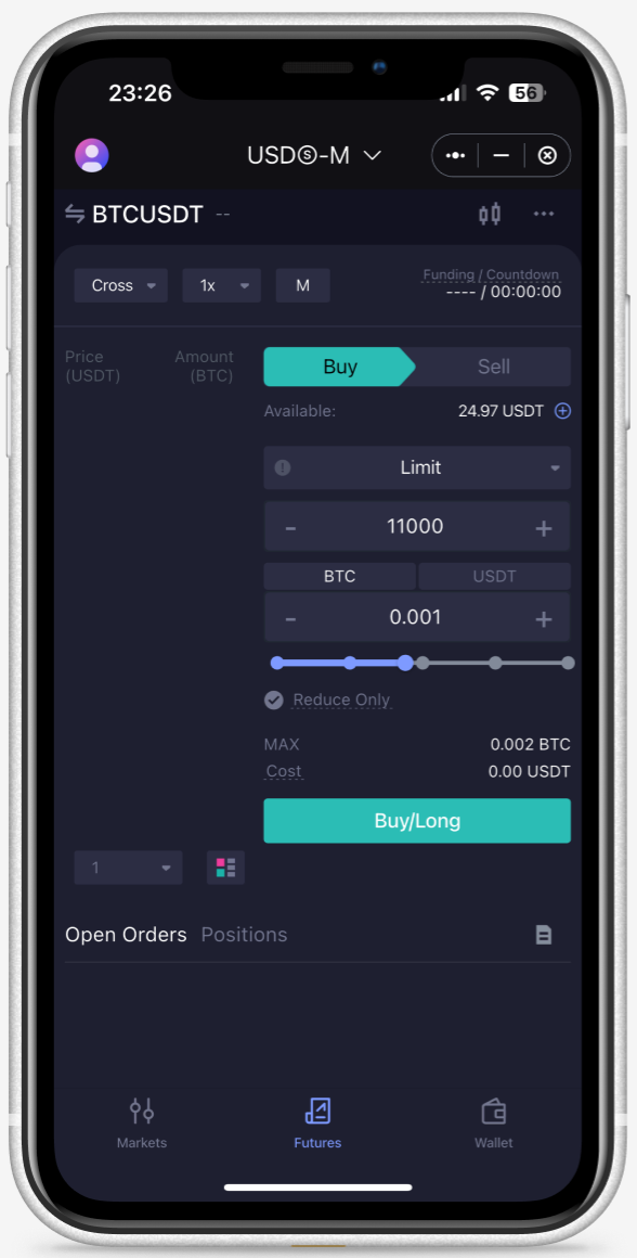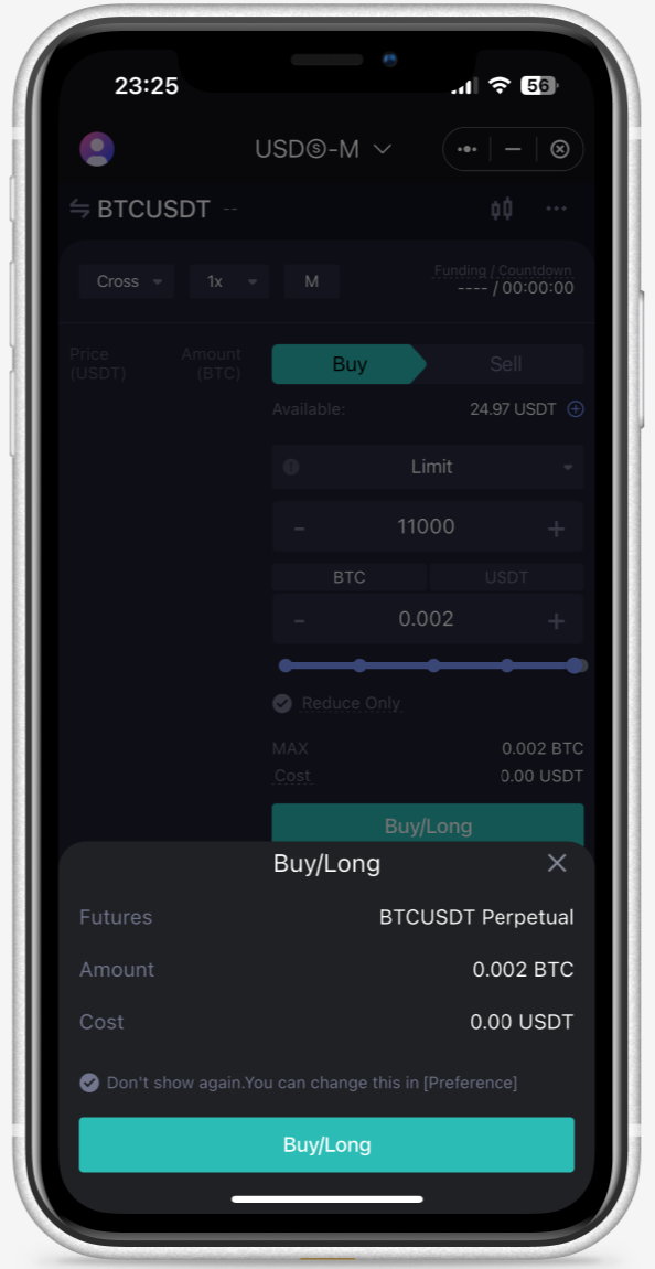 Place your Future order, like adjusting the leverage, setting the price and entering the amount of your oder, etc, after you confirm the order, click Buy Long/Sell Short.