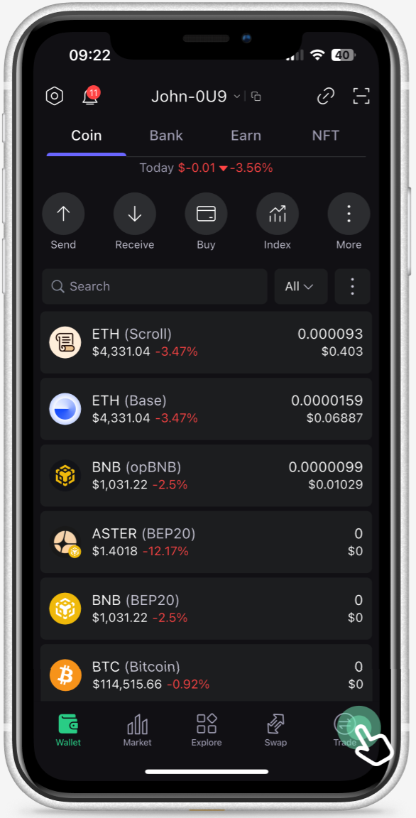Launch your SafePal App and click the Trade icon in the bottom right corner of the SafePal App screen.