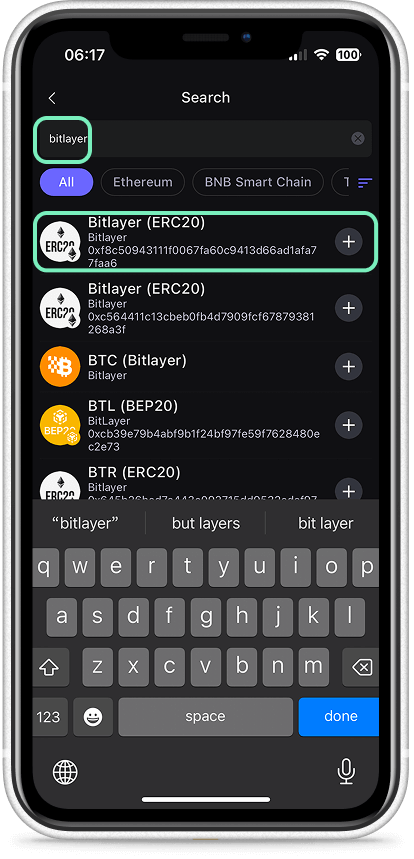 Select the coin or token you would like to add, here will be $BTC(Bitlayer) and click the ‘+’ button.