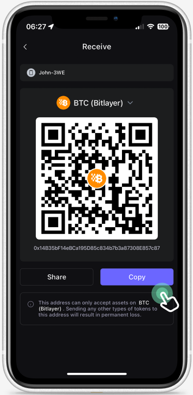 Copy or share the wallet address with your friends, and start receiving the $BTC(Bitlayer) coins using the address!