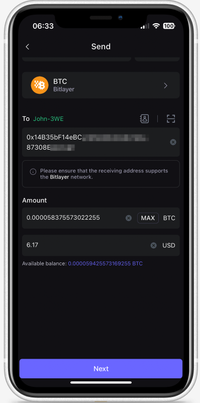 Gently click on the $BTC(Bitlayer) coins that you want to send out, and click ‘Send’.