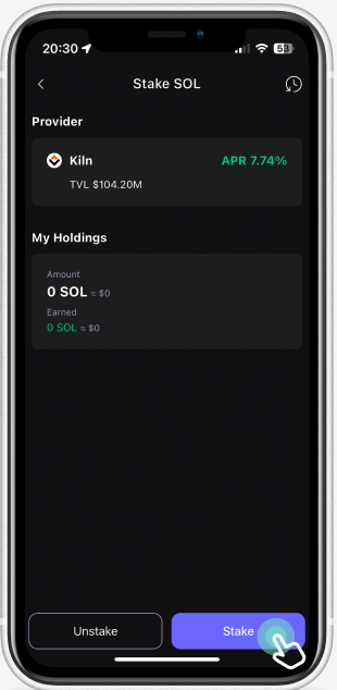 You can see the staking service provider Kiln, check the APR and your $SOL asset details, click Stake when you are ready to go.
