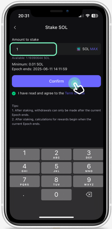 Enter the amount of $SOL that you would like to stake, after you review the staking terms and details, click Confirm to proceed next steps.